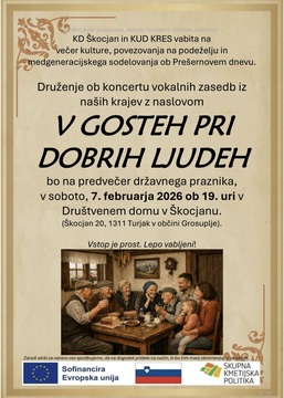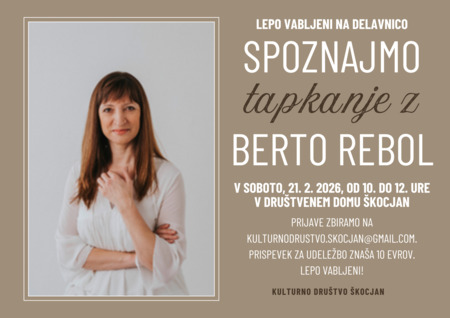 Napovedujemo: Delavnica za starejše v Škocjanu05.01.2026Občina Grosuplje v sodelovanju z Zdravstvenim domom Grosuplje in Domom starejših občanov Grosuplje vabi na delavnice za starejše, namenjene promociji zdravja in dobrega počutja. Delavnice bodo vključevale kratka predavanja, meritve telesne sestave, krvnega tlaka, moči v rokah in obsega trebuha ter zdravstvena svetovanja. V petek, 9. 1. 2026, od 9. do 12. ure, bo delavnica potekala v Društvenem domu Škocjan. Vabljeni, da se nam pridružite in skupaj naredimo korak k bolj zdravemu življenju! -