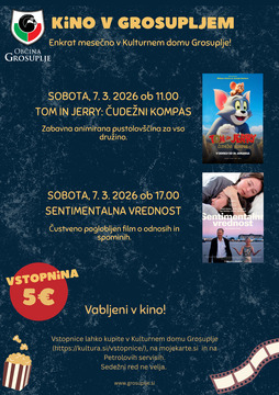 Kino v Grosupljem - vabljeni na marčevsko projekcijo!15.01.2026V občini Grosuplje po novem enkrat mesečno potekajo tudi kino projekcije, namenjene vsem generacijam. V marcu v Kulturnem domu Grosuplje: Sobota, 7. marec 2026, ob 11.00 - TOM IN JERRY: ČUDEŽNI KOMPAS, zabavna animirana pustolovščina za vso družino Sobota, 7. marec 2026, ob 17.00 - SENTIMENTALNA VREDNOST, čustveno poglobljen film o odnosih in spominih Vstopnice so na voljo: v Kulturnem domu Grosuplje: https://kultura.si/vstopnice/ na mojekarte.si na Petrolovih servisih po Sloveniji. Cena vstopnice je 5 €. Sedežni red ne velja. Vabljeni v kino, kjer bomo skupaj uživali v filmskih zgodbah na velikem platnu. -