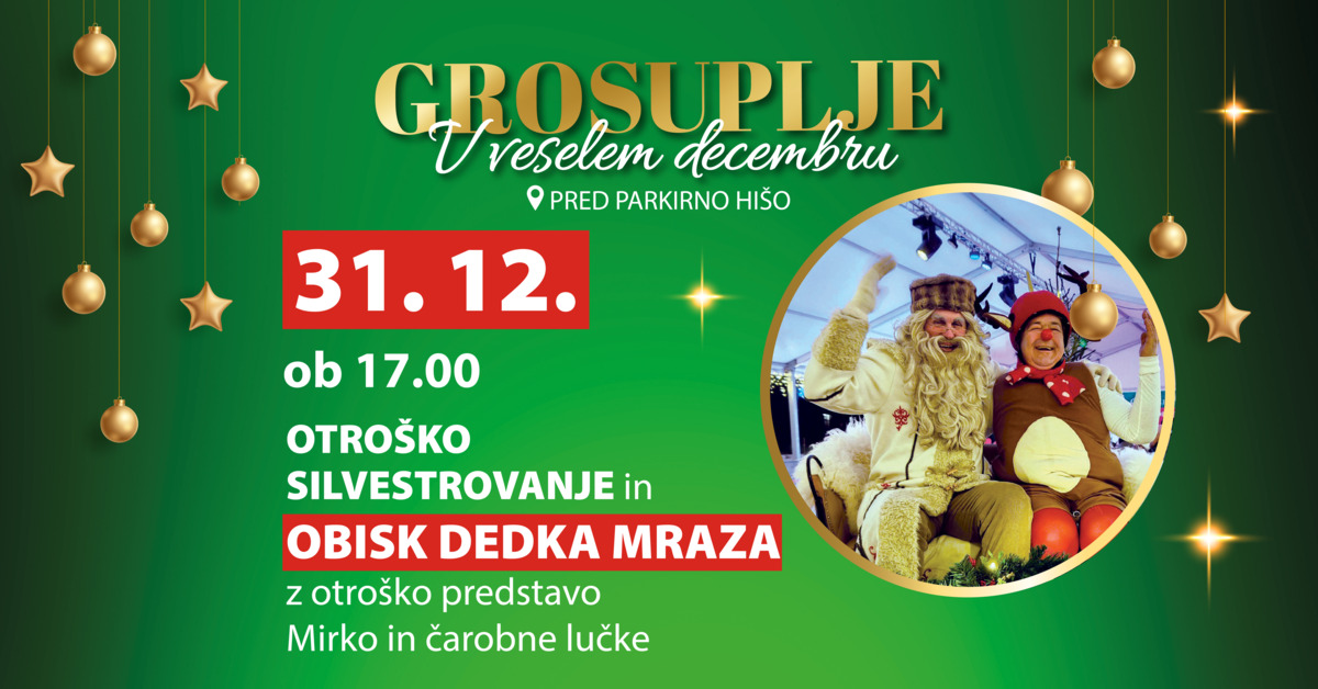 Leto bomo sklenili 31. decembra ob 17. uri z otroškim silvestrovanjem, kjer nas bo obiskal še zadnji od dobrih mož – dedek Mraz. Otroci bodo lahko uživali v predstavi Mirko in čarobne lučke, nato pa skupaj z Mirkom priklicali dedka Mraza. Z nasmehi, plesom in iskrico v očeh bomo skupaj zakorakali v novo leto.
