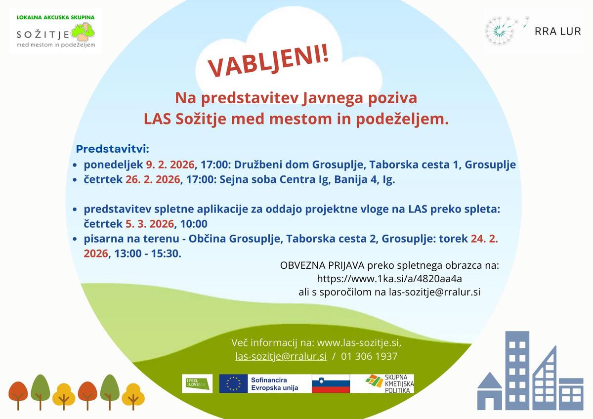 Prisotnost na spletni predstavitvi aplikacije za oddajo projektne vloge na LAS in "pisarne na terenu" v Grosupljem pa najavite na: las-sozitje@rralur.si.