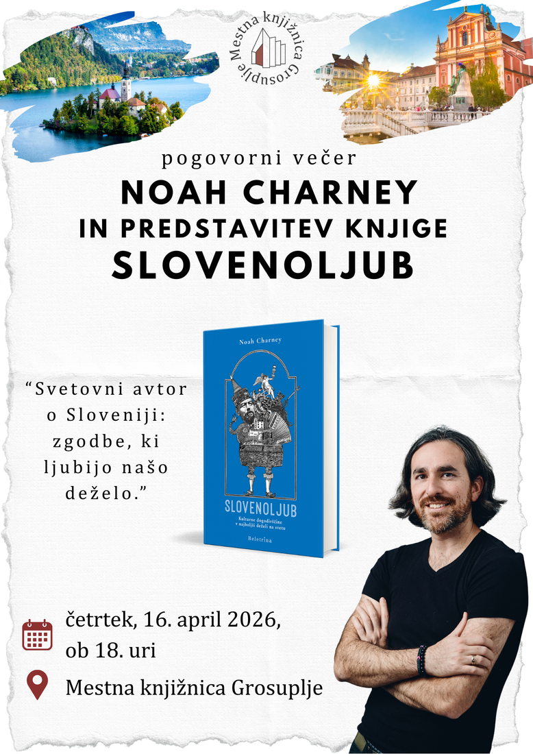 Pridružite se nam na pogovornem večeru z mednarodno priznanim pisateljem, predavateljem in poznavalcem umetnosti Noahom Charneyjem, ki bo predstavil svojo knjigo Slovenoljub. V njej skozi duhovite, pronicljive in osebne zapise raziskuje svojo ljubezen do Slovenije – dežele, ki jo je izbral za svoj dom. Avtor na edinstven način prepleta kulturne zanimivosti, zgodovinske utrinke ter vsakdanje posebnosti, ki Slovenijo delajo tako posebno.