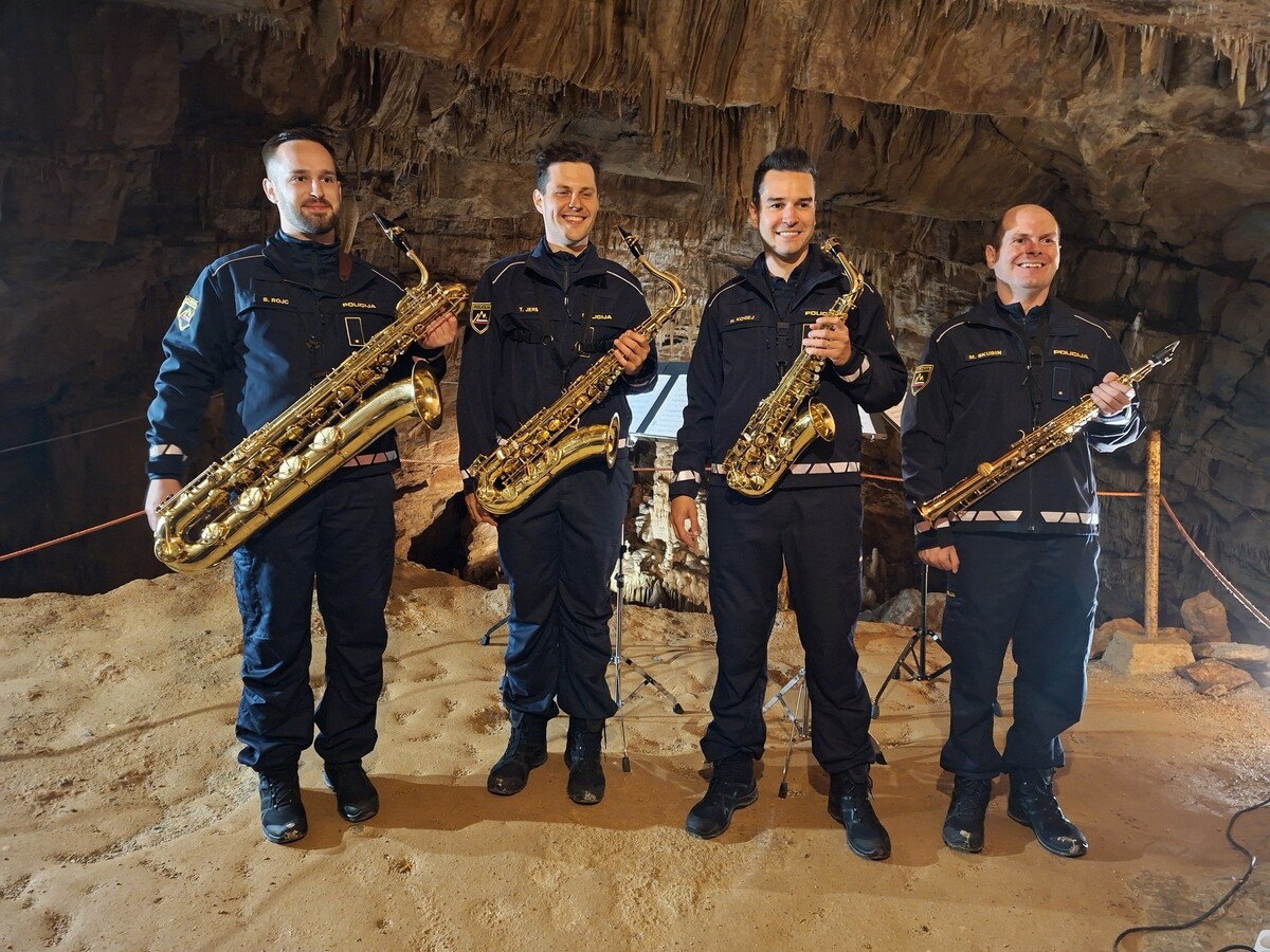 Kvartet saksofonov Policijskega orkestra je v soboto, 11. aprila 2026, zvečer s pomladnim koncertom z odmevom odprl praznovanje 100-letnice odkritja Županove jame.