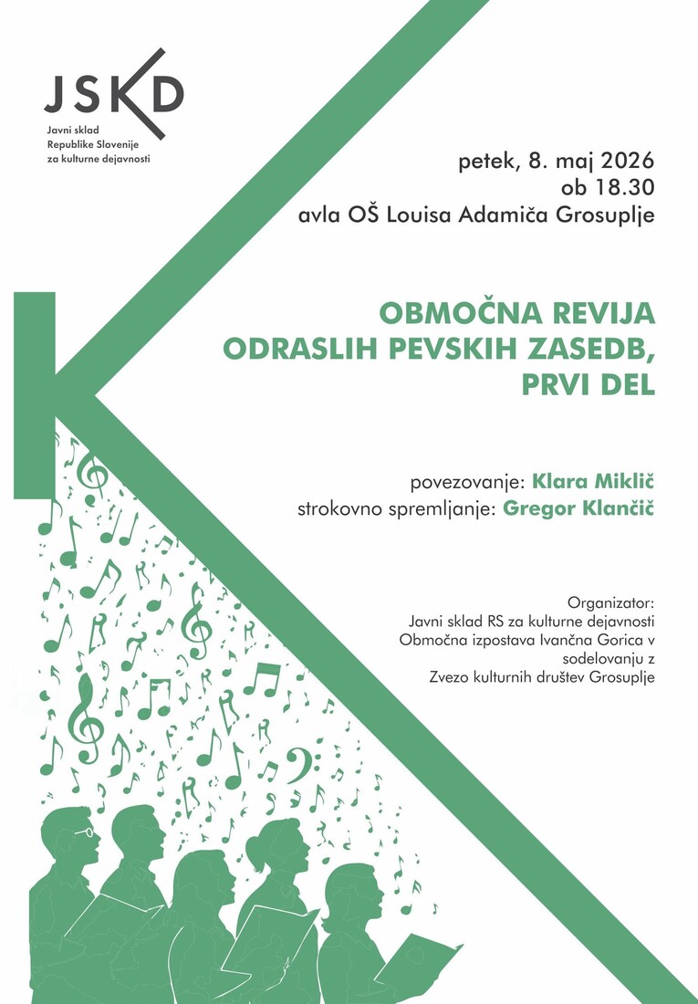Vljudno vabljeni na Območno revijo odraslih pevskih zasedb – prvi del, ki bo v petek, 8. maja 2026, ob 18.30 uri, v avli Osnovne šole Louisa Adamiča Grosuplje.