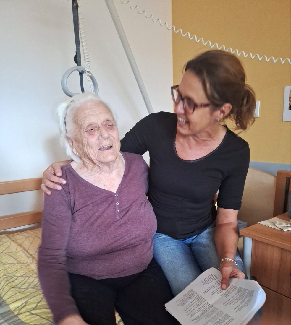 Najina srečanja največkrat potekajo v Mimini sobi. Vedno ko pridem in glasno pozdravim (Mimi je namreč skoraj slepa), se me razveseli z istimi besedami: „O, moja gospa je spet prišla!“ Sledi moje vprašanje, kaj je kaj novega. Mimi mi z veseljem pove, kdo jo je obiskal, razgovori se o svojih dveh pravnučkih, Juliji in Oskarju. Včasih tudi kaj potoži. Poskušam jo razumeti, saj je pri 91 letih vendar običajno, da človeka kaj boli, da je utrujen, da ga kaj zmoti. Potem jo zanima, kaj je novega pri meni. Kako mož, kako sinovi, kako služba. Mi je fižol že kaj obrodil? Neverjetno si vse zapomni. Nazadnje sem jo razveselila z novico, da se je najstarejši sin zaročil. Kadar ne drema, naju z zanimanjem posluša tudi sostanovalka Rezi, ki je sicer nepokretna, jo pa vsak obisk razvedri. Običajno pokuka skozi vrata še gospa Ani in še njo povabiva, da prisede in skupaj popijemo dobro kavico iz avtomata. Nato velikokrat sledi sprehod po hodniku. Mimi je kljub svoji visoki starosti in slepoti prava borka. Jaz usmerjam in držim njeno hojico, da se ne zaleti. Potem bereva. Najbolj jo razveselim, če kje najdem kakšen članek o njenem domačem Grintovcu in Dolenjski. Zelo rada posluša tudi knjige grosupeljskega župnika, trenutno sva začeli brati njegovo najnovejšo knjigo Na spletni prižnici 2. Branje jo vedno spravi v zelo dobro voljo. Obisk vedno prehitro mine, pravi Mimi. Na koncu se objameva, obljubim ji, da spet pridem, pomaha mi tudi Rezi iz postelje. Domov se vrnem polna energije, hvaležna, da sva se z Mimi spoznali. Prostovoljstvo človeka res obogati!