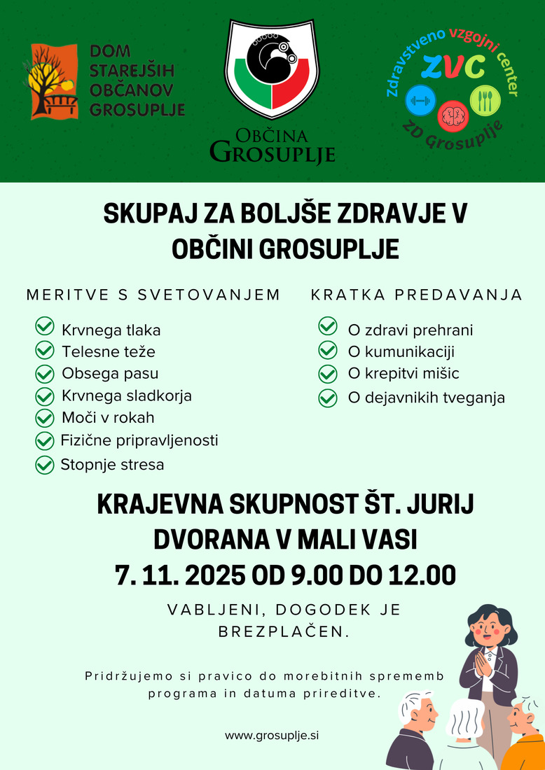 Občina Grosuplje v sodelovanju z Zdravstvenim domom Grosuplje in Domom starejših občanov Grosuplje vabi na delavnice za starejše, namenjene promociji zdravja in dobrega počutja.