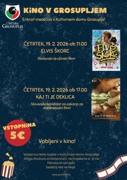 Kino v Grosupljem - vabljeni na februarsko projekcijo!15.01.2026Po uspešnih decembrskih in januarskih filmskih dnevih se Mesečni kino v Grosuplju vrača tudi februarja. V času šolskih počitnic vas vabimo v Kulturni dom Grosuplje, kjer si boste lahko ogledali dva slovenska filma za vse generacije. Četrtek, 19. februar 2026, ob 11.00 - ELVIS ŠKORC, slovenski družinski film Elvis (14), ki ga svet ne razume, je navdušen nad kemijo, stripi in Hano, najlepšim dekletom v šoli. Njegovo življenje se obrne na glavo, ko se starši ločijo, on pa ostane z mamo, mlajšo sestro in babico. Nepričakovani družinski vrtiljak doseže vrhunec, ko mama oznani, da je noseča. V smešni, zabavni in dinamični najstniški odiseji Elvis nekako razreši vse svoje težave in sestavi svoje razbito življenje. Četrtek, 19. februar 2026, ob17.00 - KAJ TI JE DEKLICA, slovenski kandidat za oskarja za med -