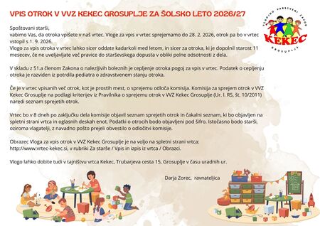 Vpis otrok v VVZ Kekec Grosuplje za šolsko leto 2026/2716.01.2026Obvestilo -