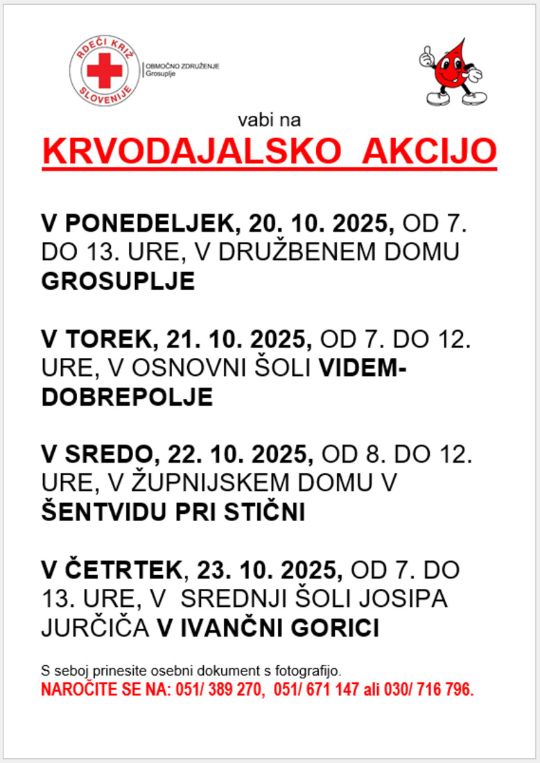 Rdeči križ Slovenije - Območno združenje Grosuplje vabi na krvodajalsko akcijo, v ponedeljek, 20. 10. 2025, od 7. do 13. ure, v Družbenem domu Grosuplje.