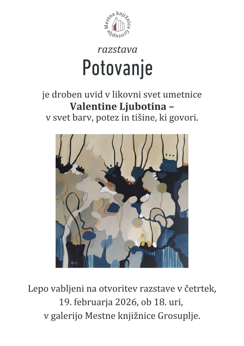Otvoritev razstave bo v četrtek, 19. februarja 2026, ob 18. uri, v galeriji Mestne knjižnice Grosuplje.