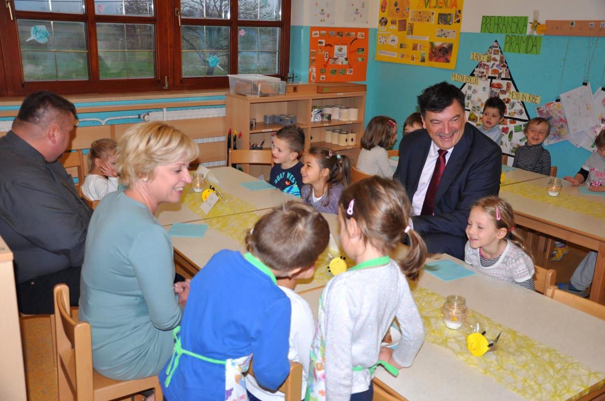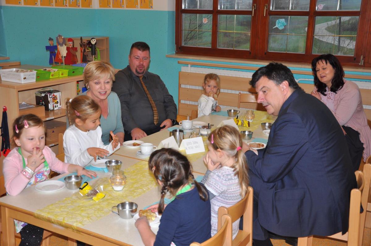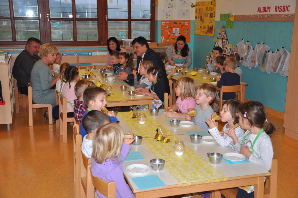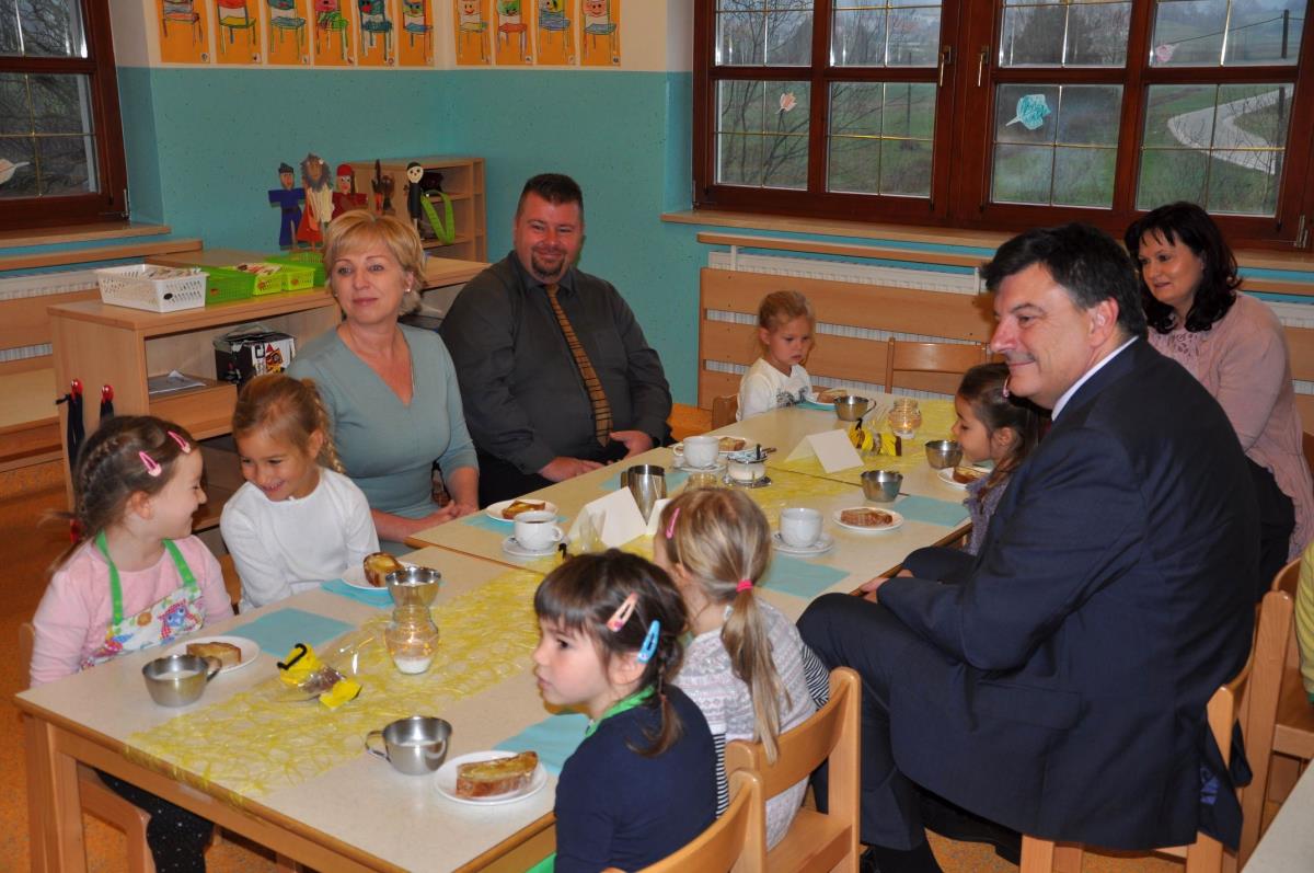 Otrokom v vrtcu Jurček so se na tradicionalnem slovenskem zajtrku pridružili župan dr. Peter Verlič, direktor občinske uprave mag. Dušan Hočevar in evropska poslanka Romana Tomc