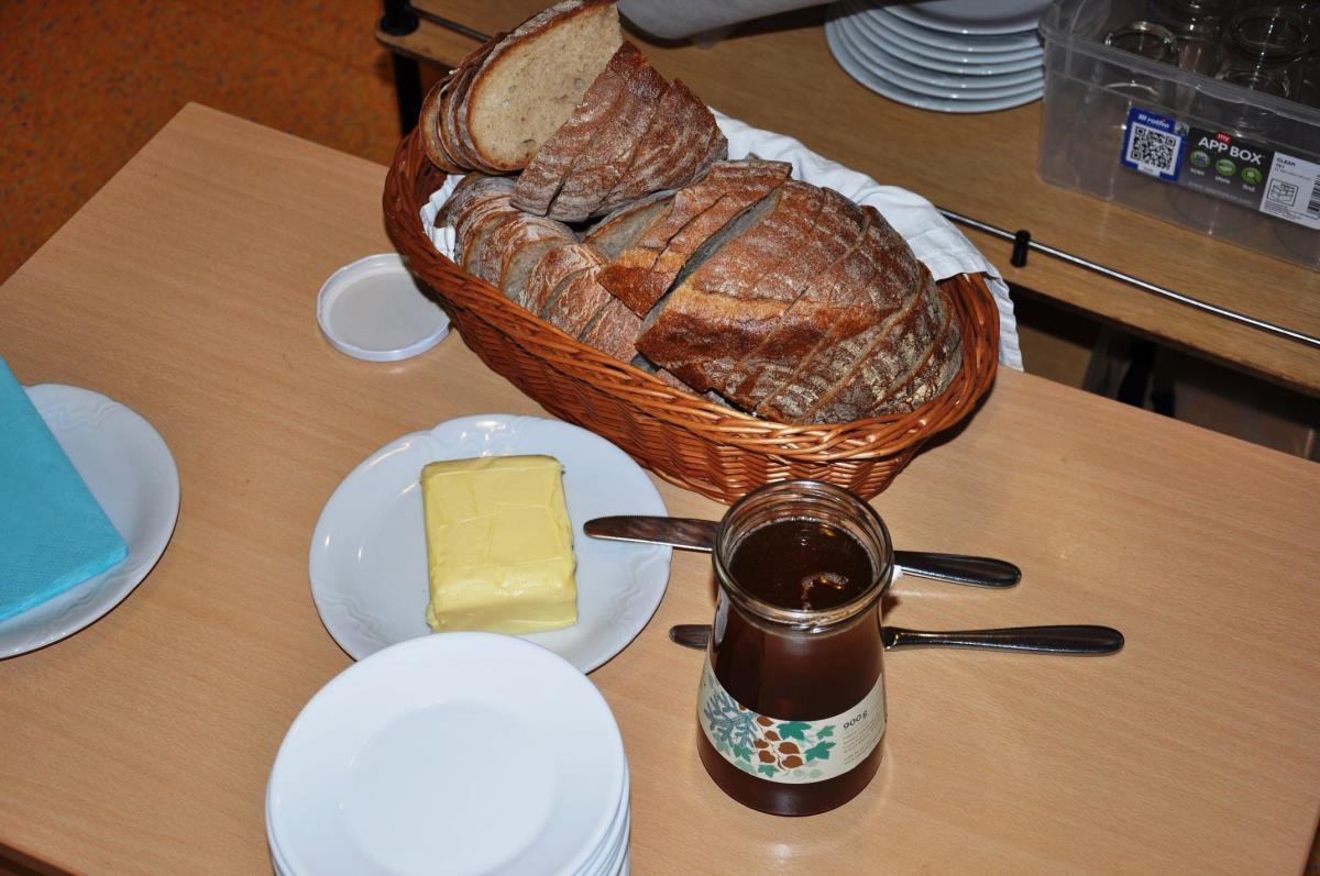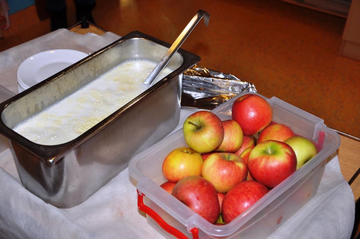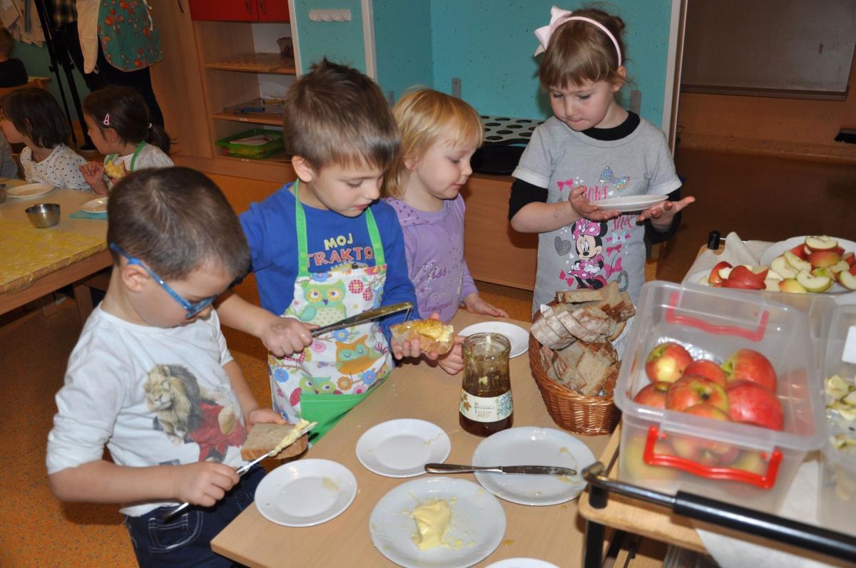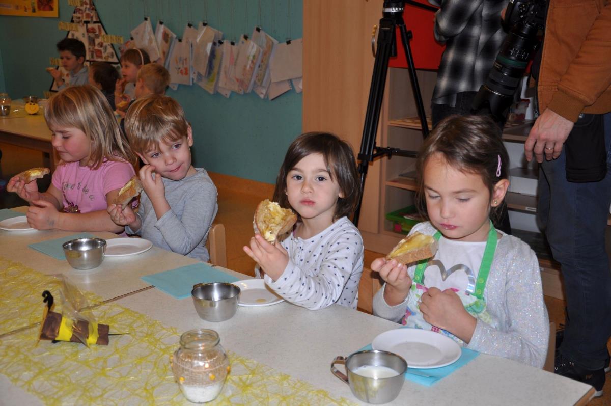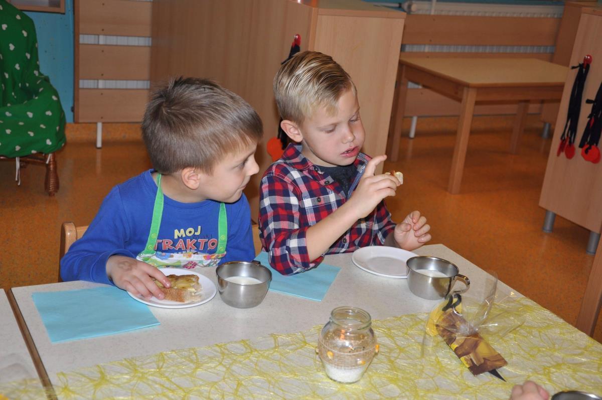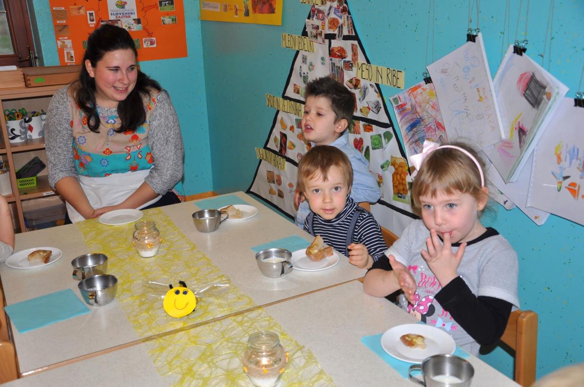 Mojstri Jurčki, kot pravijo dežurnim otrokom v vrtcu, so svojim gostom pa tudi ostalim otrokom v vrtcu postregli s kruhom, na katerega so namazali maslo in med, za tem pa še skodelico mleka in jabolko. Za prijetno presenečenje je na koncu poskrbela še potica.