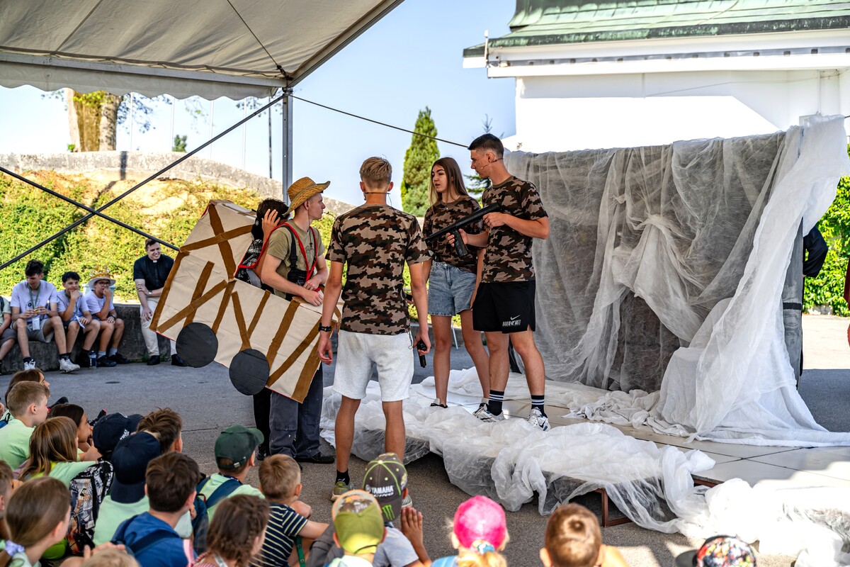 Vsako jutro se je začelo pred 7. uro s sestankom v stari cerkvi, kjer smo uskladili dnevni načrt. Ob 8. uri smo otrokom prvič pomahali z vrha hriba in skupaj dvignili oratorijsko zastavo. Sledila je dramska igra – hagiodrama – s katero smo otrokom vsak dan približali življenje Alojzija Grozdeta: njegovo otroštvo, vero, pogum, trpljenje in svetost. Dramski prizori so otroke ganili, nasmejali, v njih prebudili vprašanja – in že s tem se je začelo oratorijsko srce dneva.