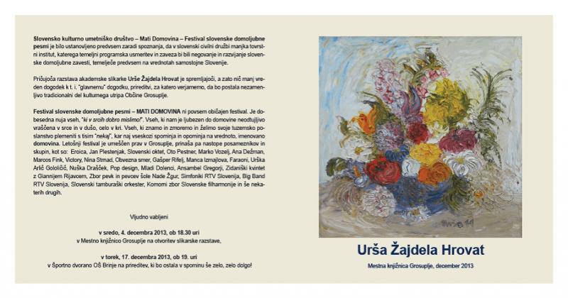Že v SREDO, 4. decembra 2013 ob 18.30 uri, pa lepo vabljeni v Mestno knjižnico Grosuplje na OTVORITEV SLIKARSKE RAZSTAVE akademske slikarke Urše Žajdela Hrovat. Specialnost slikarstva Urše Žajdela Hrovat so rože. Pričujoča razstava je spremljajoči, a zato nič manj vreden dogodek k t. i. »glavnemu« dogodku. Z otvoritvijo razstave bomo namreč tudi uradno napovedali 2. festival slovenske domoljubne pesmi Mati domovina, ki bo 17. decembra 2013, v Grosupljem.