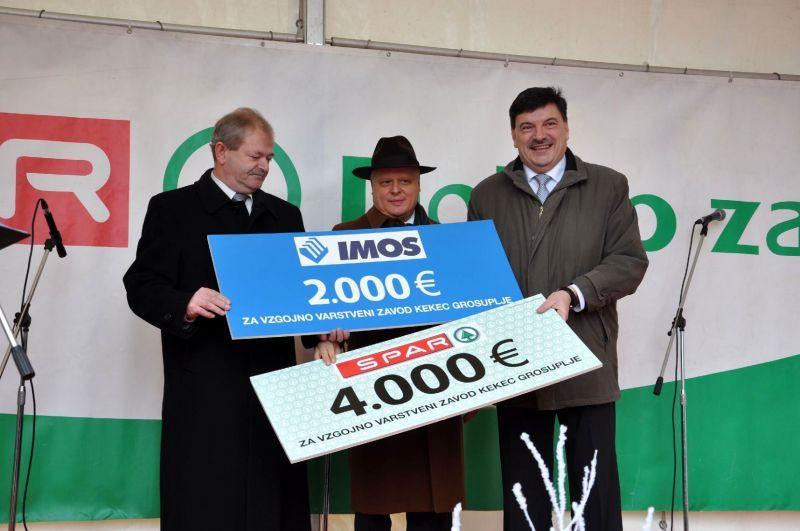 G. Domjan je ob otvoritvi trgovine Spar županu občine Grosuplje predal darilni bon v višini 4.000 eur, g. Kastelic pa darilni bon v višini 2.000 eur. Župan se je za to dobrodelno noto v imenu vseh občanov občine Grosuplje tako Sparu Slovenija kot podjetju IMOS d.d. iskreno zahvalil ter na oder povabil go. Majdo Fajdiga, ravnateljico Vzgojno varstvenega zavoda Kekec, ki je darilna bona tudi prevzela. Donacijo se bo namreč namenilo za nakup igral na otroškem igrišču Vzgojno varstvenega zavoda Kekec.