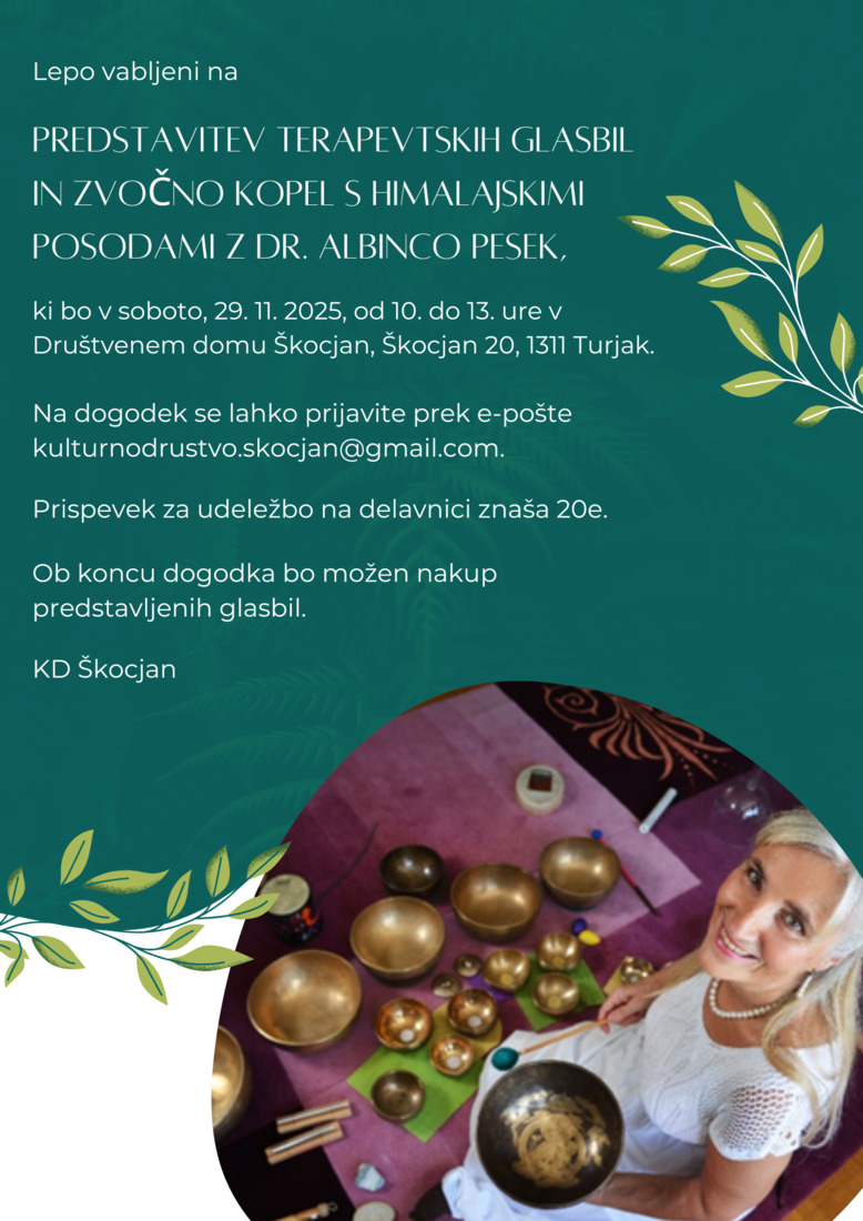 vljudno vabljeni na predstavitev terapevtskih glasbil in zvočno kopel s himalajskimi posodami z dr. Albinco Pesek, ki bo potekala v soboto, 29. novembra 2025, od 10. do 13. ure, v Društvenem domu Škocjan, Škocjan 20, 1311 Turjak.