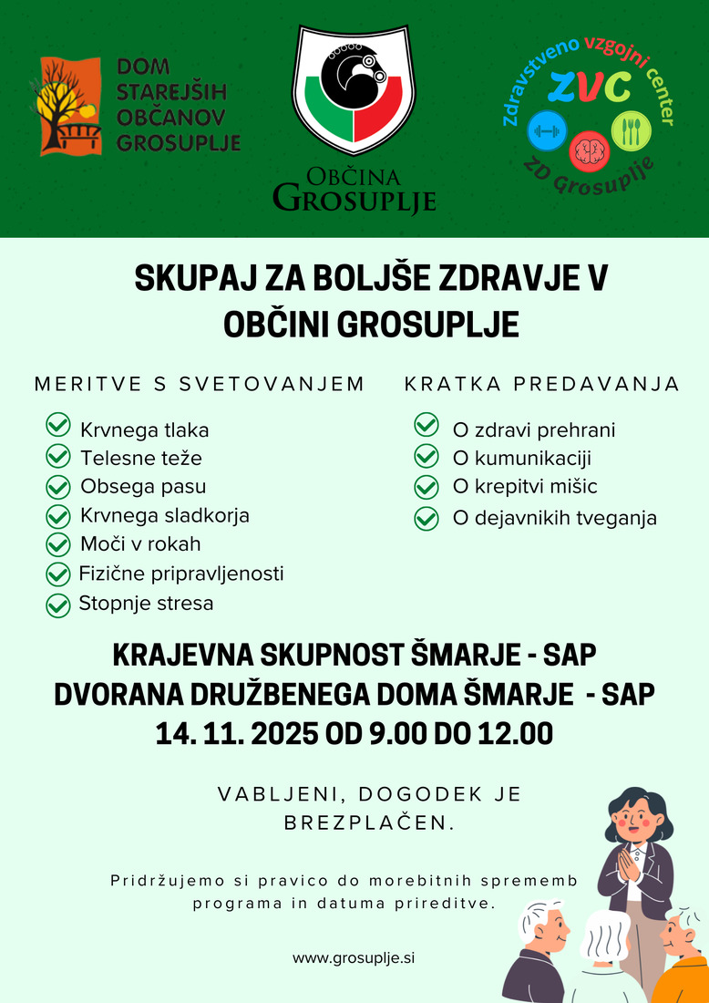 Občina Grosuplje v sodelovanju z Zdravstvenim domom Grosuplje in Domom starejših občanov Grosuplje vabi na delavnice za starejše, namenjene promociji zdravja in dobrega počutja.