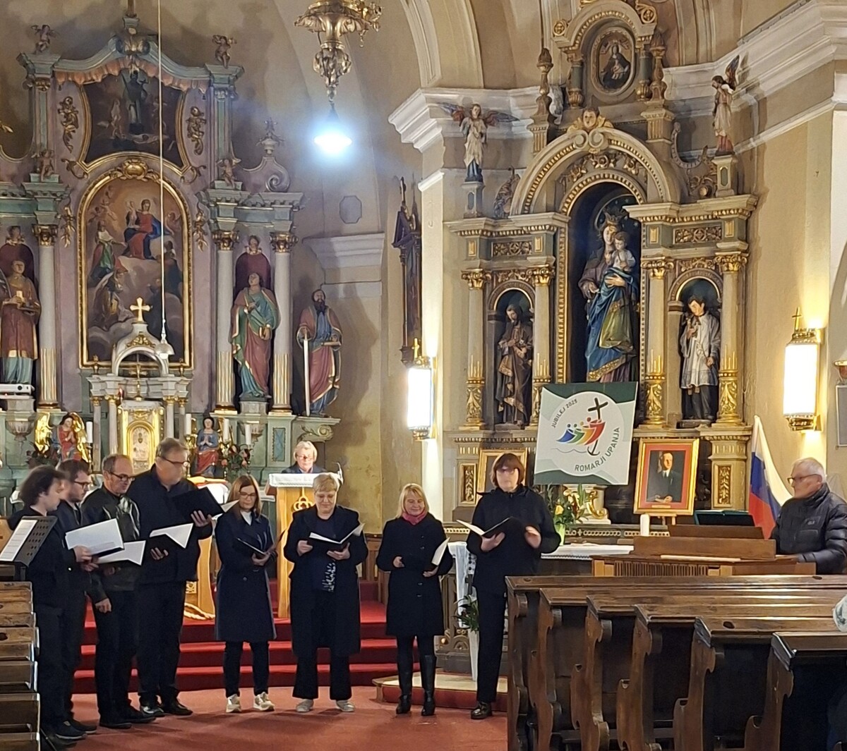 Pevke in pevci so zatem občinstvo popeljali še skozi različna glasbena obdobja, od božičnih pesmi Od nebes prido angeli in Eno je dete rojeno do baročnih skladb Michaela Praetoriusa in Johanna Sebastiana Bacha Jezus moje je veselje, Mozartove Ave Marije ter Vodopivčeve pesmi Tisoč slavospevov krasnih. Večer se je zaključil z domoljubno skladbo Jožeta Osane Slovenija, zapojmo ti, ki je v duhu praznikov združila zbrane v spoštovanju do domovine in slovenske besede.