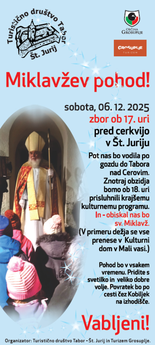 Turistično društvo Tabor Št. Jurij v soboto, 6. 12. 2025, vabi na Miklavžev pohod. Zbor bo ob 17. uri, pred cerkvijo v Št. Juriju.