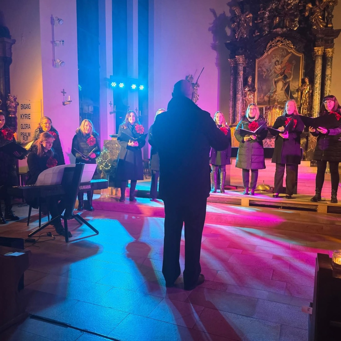 Naš navdihujoči zborovodja Fernando Pablo Mejías vedno skrbno sestavi program skladb in skrbi, da se koncert začne samozavestno in z glasbenim nabojem. Prvi vtis je pomemben – zato smo večer začeli z udarno latinsko Laudate Dominum. Ob spremljavi flavte (Katarina Mejias) in klavirja (Eva Igličar) smo kasneje nežno prešli v Angelček, varuh moj v priredbi Damijana Močnika, mehko, toplo skladbo, ki je pobožala občinstvo in nas spomnila, da stopamo v advent – čas tišine, pričakovanja in notranjega miru. A brez izziva pri pevcih ne gre. Možgane smo dobro predramili s skladbo En stjerne klar (norveško: Jasna, svetla zvezda), katere besedilo in jezik nista prav nič prizanesljiva – a ravno zato je zmaga toliko slajša, ko melodija steče tako, kot smo si zamislili. Večer smo zaključili tako, kot smo ga začeli: pogumno, močno in energično. Črnska duhovna Babylon’s Falling je dvignila tempo, srce in dvorano.