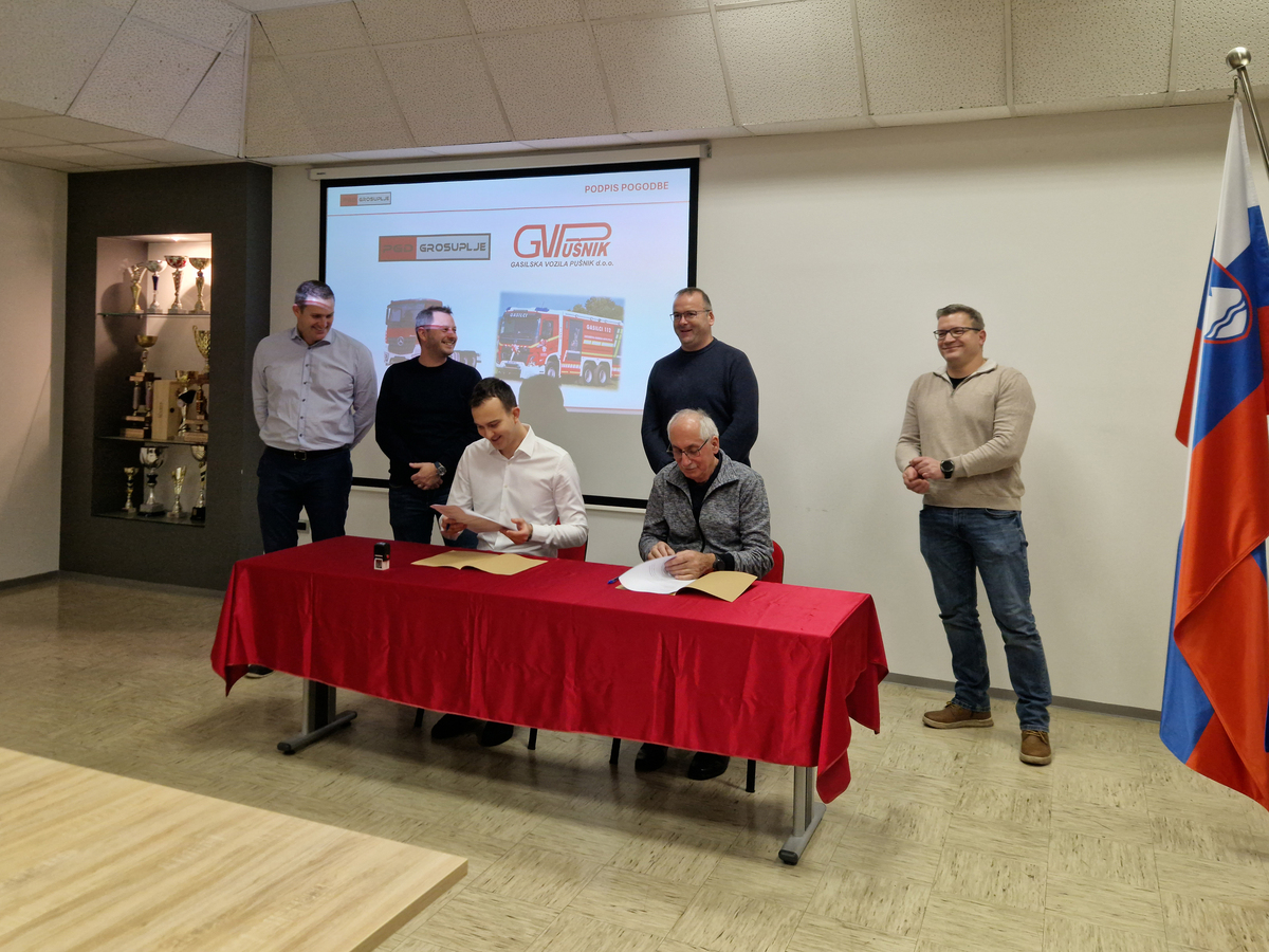 Grosupeljski gasilci smo v prazničnem decembru dočakali trenutek, ki smo ga z velikimi pričakovanji gradili zadnji dve leti. V soboto, 13. 12. 2025, smo se članice in člani PGD Grosuplje zbrali na slovesnem podpisu pogodbe za dobavo nove gasilske avtocisterne GVC-3. Pogodbo smo sklenili s podjetjem Gasilska vozila Pušnik, ki je v postopku javnega naročila oddalo najugodnejšo ponudbo. S to posodobitvijo voznega parka bomo čez dobro leto dni v zaslužen pokoj pospremili staro avtocisterno, ki nam je zvesto služila dolgih 30 let.
