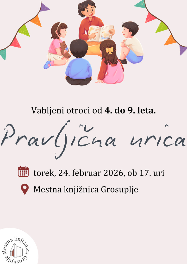 V Mestni knjižnici Grosuplje pravljične urice za otroke od 4. do 9. leta potekajo vsak torek od 17.00 do 17.45. Na pravljični uri otroci poslušajo izbrano zgodbo, se o njej pogovorijo, nato pa ustvarjajo ali se igrajo.