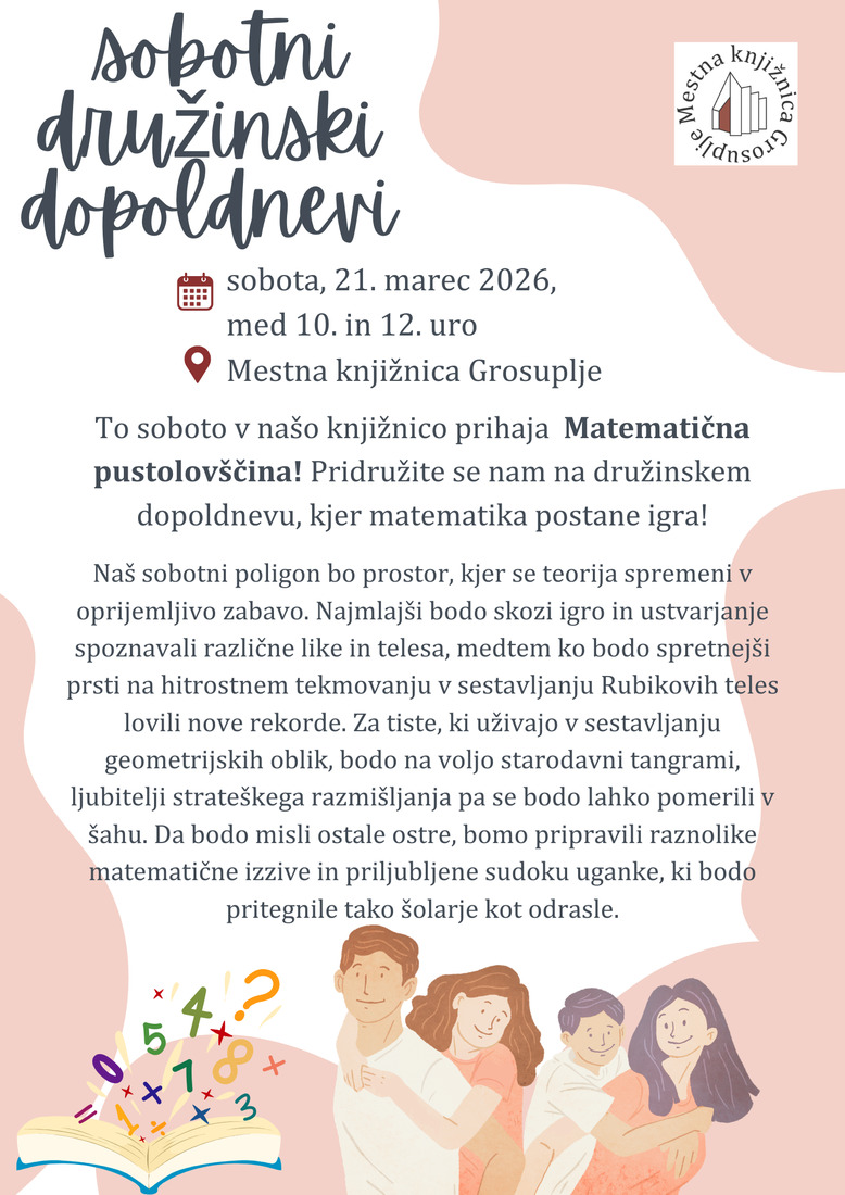 V soboto, 21. marca 2026, od 10. do 12. ure, vabljeni v Mestno knjižnico Grosuplje na Sobotno družinsko dopoldne: Matematična pustolovščina s Tejo Kovač in Vanjo Špelko.