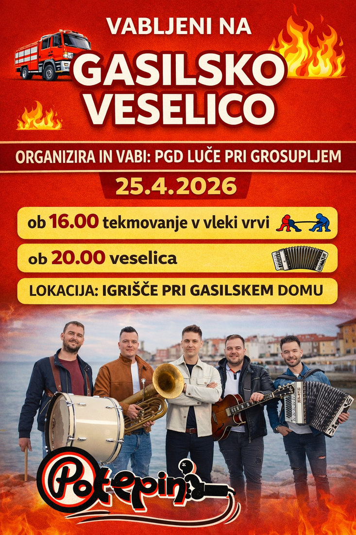 PGD Luče vabi na gasilsko veselico z ansamblom Potepini, ki bo v soboto, 25. 4. 2026, na igrišču pri gasilskem domu.