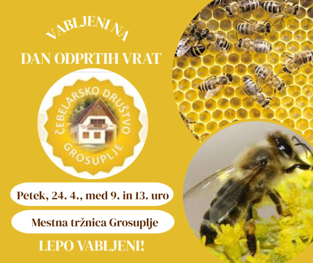Čebelarsko društvo Grosuplje se bo predstavilo na Mestni tržnici Grosuplje v petek, 24. aprila 2026, med 9. in 13. uro.