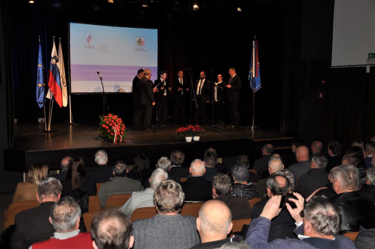 V sredo, 19. decembra 2018, je v dvorani Kulturnega doma Grosuplje potekala prireditev ob dnevu samostojnosti in enotnosti ter 8. obletnici Združenja za vrednote slovenske osamosvojitve. 26. decembra bo namreč minilo 28 let od razglasitve rezultatov plebiscita o samostojni Sloveniji, ki je potekal 3 dni prej, 23. decembra. S ponosom smo se tako spomnili dogodkov, ki so botrovali, da smo Slovenci končno uresničili svoje sanje, življenje v samostojni in demokratični državi, v domovini Sloveniji. Pred natanko 8 leti pa je bilo ustanovljeno tudi Združenje za vrednote slovenske osamosvojitve, ki združuje ljudi, ki so aktivno sodelovali pri osamosvojitvi slovenskega naroda, pa tudi posameznice in posameznike, ki jim vrednote in ideali slovenske osamosvojitve predstavljajo navdih za današnje in prihodnje delovanje.