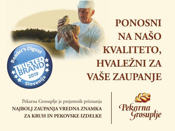 Znani so rezultati raziskave Trusted Brand 2019, ki je pod okriljem revije Reader‘s Digest Slovenija potekala že trinajsto leto. Med blagovnimi znamkami, ki jim Slovenci najbolj zaupamo je tudi Pekarna Grosuplje kot najbolj zaupanja vredna znamka za kruh in pekovske izdelke.