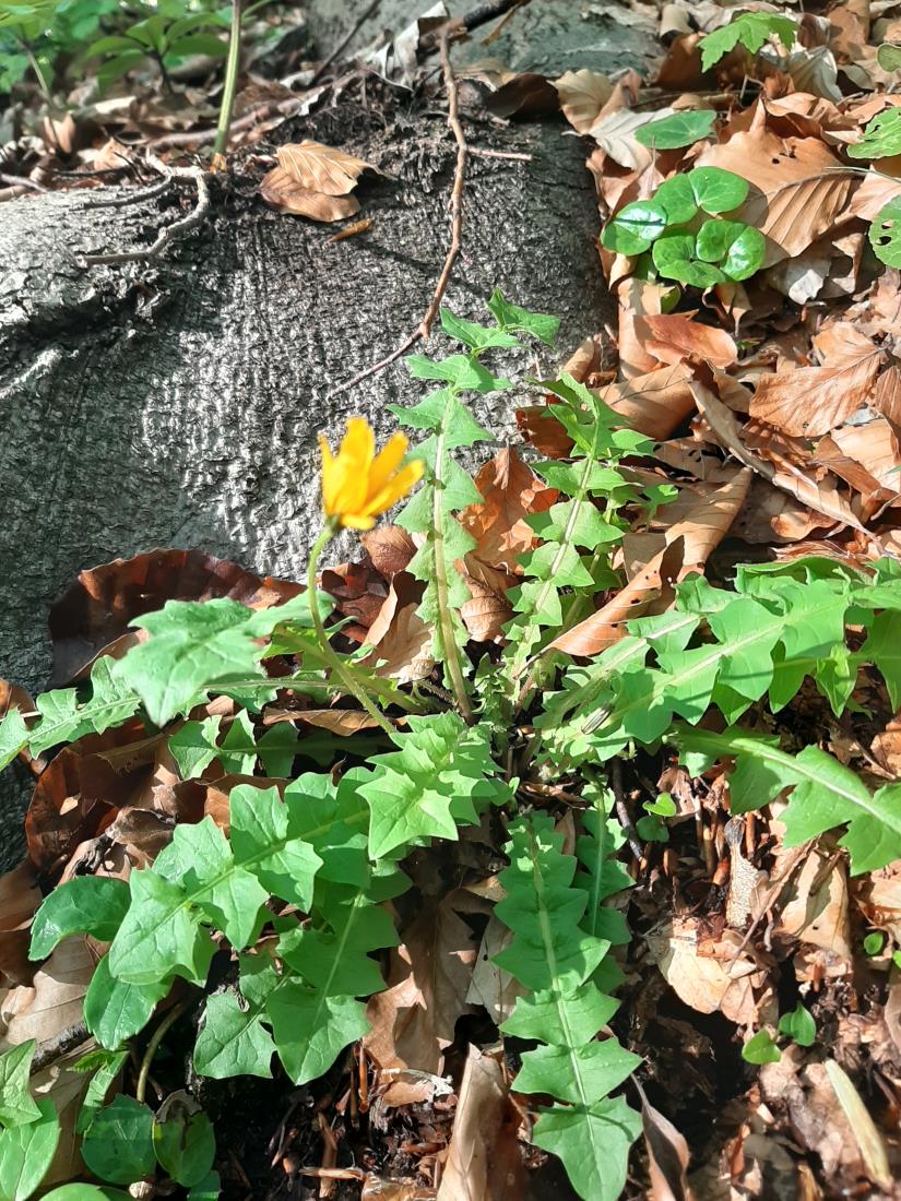 Na sliki navadna smrdljivka ali gozdni regrat (Aposeris foetida) in mladi bukovi listi.