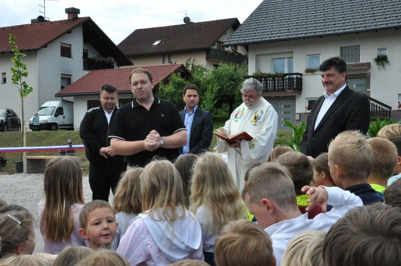 Duhovni pomočnik Stane Kerin je nov park z igrali blagoslovil, še prej pa je malčkom povedal, da se vedno, ko je v družbi otrok, spomni na otroke na Madagaskarju, kjer je bil letos na obisku pri misijonarju Pedru Opeki. »Približno čez kakšno uro se bodo otroci tam zbrali, da bodo dobili vsak en krožnik riža. To je edino, kar dobijo v celem dnevu za jesti,« je dejal. Zaželel jim je, da se bodo imeli na novih igralih lepo, da bodo uživali na počitnicah, v jeseni, ko se bodo spet vrnili v šolo, pa se pridno učili. »Otroci v Afriki bi radi šli v šolo, se učili, pa nimajo niti zvezka in svinčnika,« je še povedal.