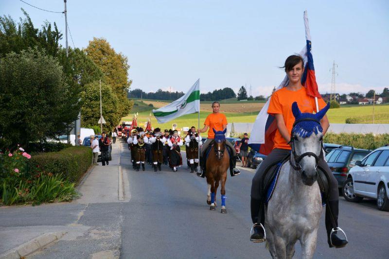Pričetek slovesnosti na Velikem Mlačevem je v soboto, 9. avgusta 2014, naznanila častna parada gasilk in gasilcev. Na njenem čelu sta na konju z zastavama prijezdili domačinki Kaja Jerlah in Kaja Kadunc. Takt gasilcem je dajala Mengeška godba, za njimi pa so se v povorki zvrstili pionirji in mladinci Prostovoljnega gasilskega društva Veliko Mlačevo. Visoko so vihrali prapori iz vseh 18 gasilskih društev v naši občini, vodil pa jih je gasilski častnik Janez Jereb. Sledil je mimohod pešanonov s poveljnikom in gasilskim častnikom prve stopnje Petrom Sejetom na čelu, parado pa je zaključilo okoli 20 gasilskih vozil z avtomobilom domačega društva na čelu.