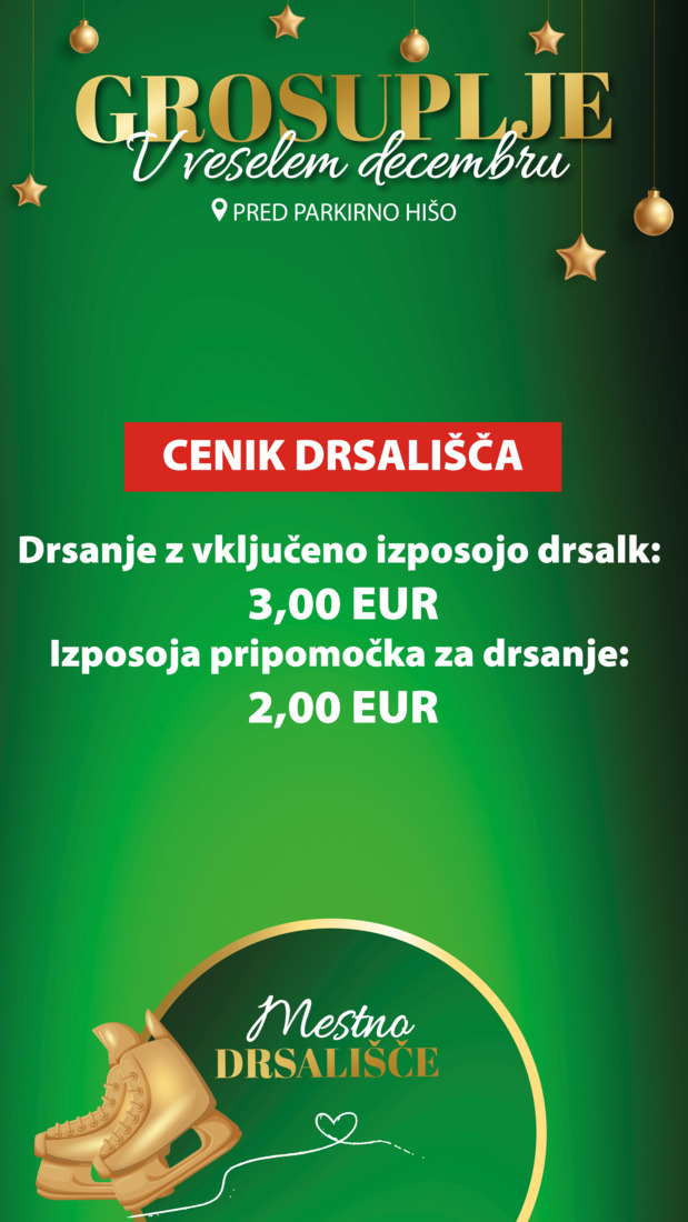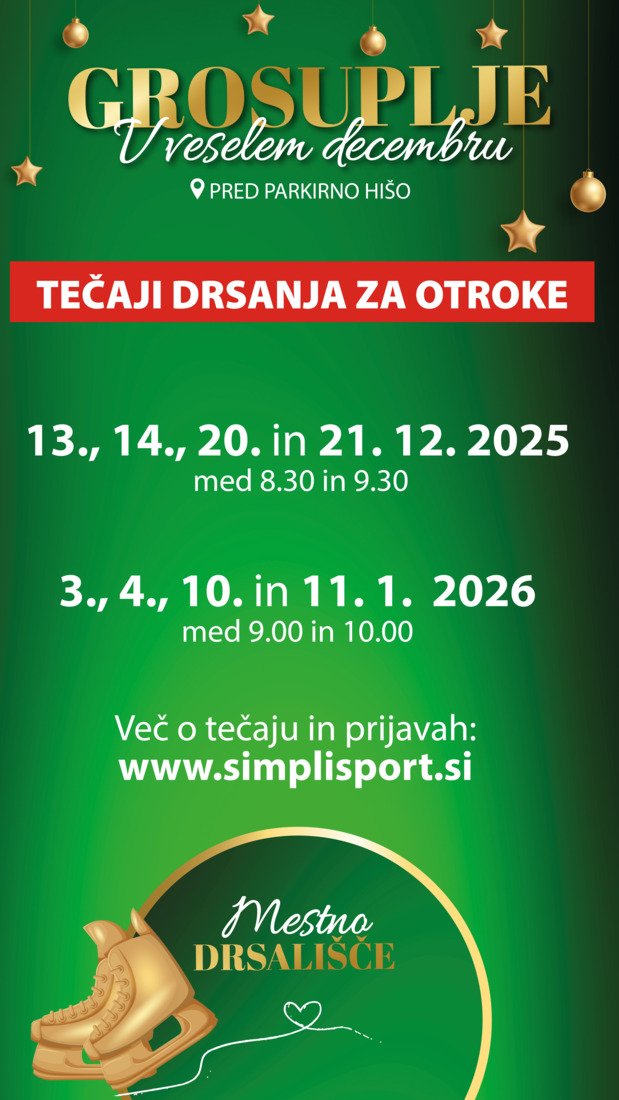 Tečaji drsanja za otroke - 13., 14., 20. in 21.12. med 8.30 in 9.30 ter 3., 4., 10. in 11.1. med 9.00 in 10.00. Več o tečaju in prijave na www.simplisport.si.