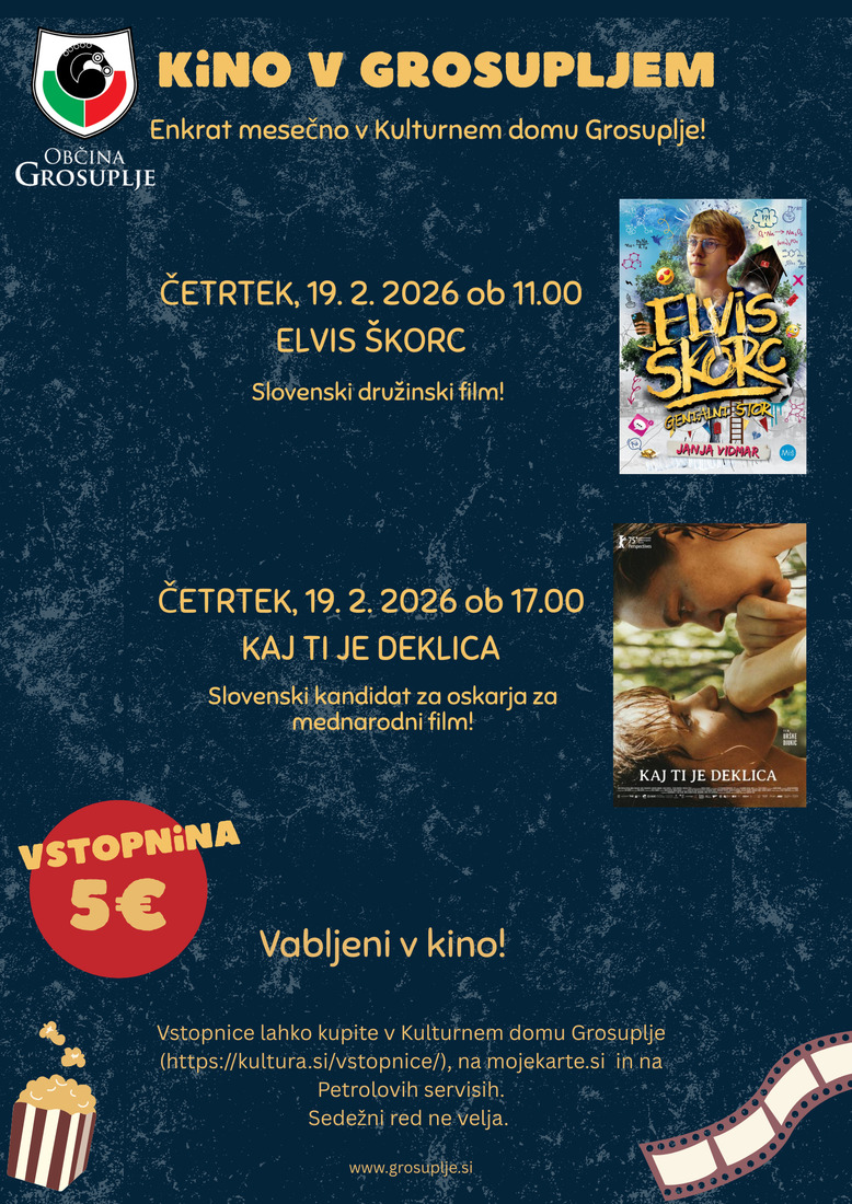 Po uspešnih decembrskih in januarskih filmskih dnevih se Mesečni kino v Grosuplju vrača tudi februarja. V času šolskih počitnic vas vabimo v Kulturni dom Grosuplje, kjer si boste lahko ogledali dva slovenska filma za vse generacije.